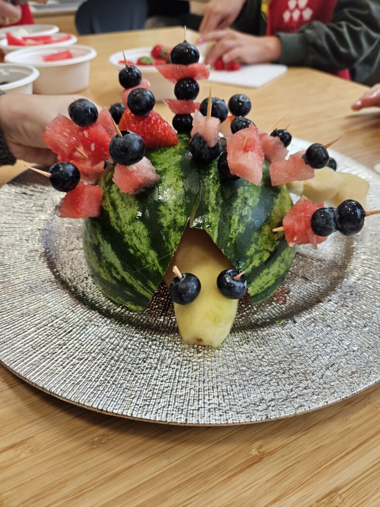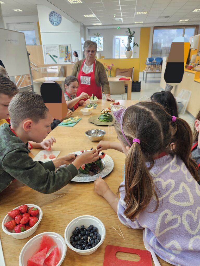 In de laatste les hebben zij egels gemaakt van fruit en groente.  De kinderen werden verdeeld in twee groepen. Eén groep mocht spiesjes maken van komkommer, tomaat, blauwe bessen, kaas, meloen en banaan. Tijdens het maken mochten ze ook al lekker eten.  De tweede groep ging aan de slag met ketchup, bladerdeeg en vega-knakworstjes en maakte heerlijke worstenbroodjes.